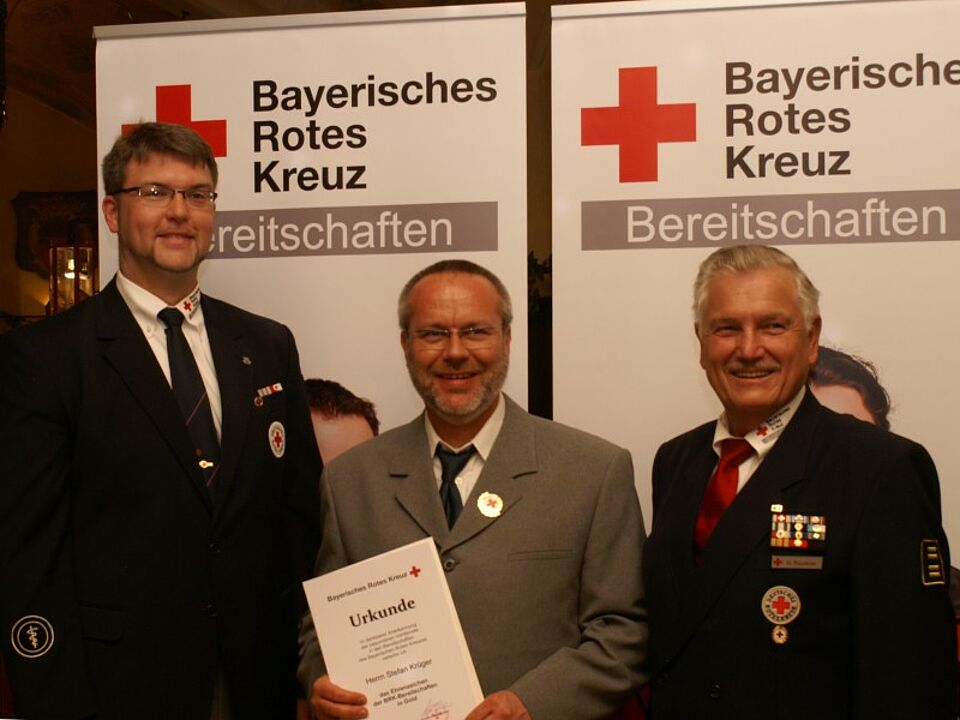 Ein bisschen Überwindung haben Stefan Krüger und Matthias Neuhöfer für ihre Dienstreise in die Landeshauptstadt nach München aufbringen müssen: Unendlich viel Lob kassieren und damit im Mittelpunkt stehen ist nicht so ihr Ding. Mit Kreisbereitschaftsleiter Martin Falger und Bereitschaftsleiter Manfred Neuhöfer waren zwei Führungskräfte aus dem BRK Kreisverband Würzburg mitgefahren um die beiden bei ihrer Auszeichnung mit dem goldenen Ehrenzeichen der Bereitschaften zu unterstützen. Ehrenzeichen und Urkunden gab es aus den Händen von Landesbereitschaftsleiter Harald Pruckner.