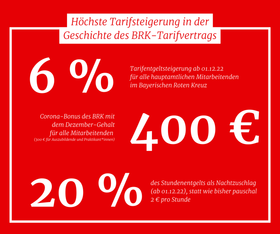 Das Bayerische Rote Kreuz reagiert auf die steigenden Lebenshaltungskosten. Mit Entschiedenheit und im Sinne der Mitarbeiterinnen und Mitarbeiter vereinbarte das Bayerische Rote Kreuz gemeinsam mit der Gewerkschaft ver.di eine historische Tarifsteigerung in Höhe von 6,0 % bereits ab 1. Dezember 2022.