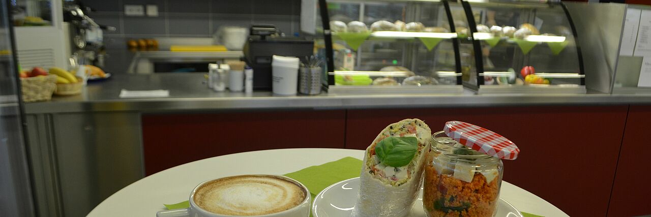 Das Angebot reicht von verschiedenen Getränken, gemischten Pausensnacks wie Sandwiches, Leberkäsbrötchen, Obst, vegetarische Speisen bis zum Müsliriegel u.v.a. zu günstigen Preisen.